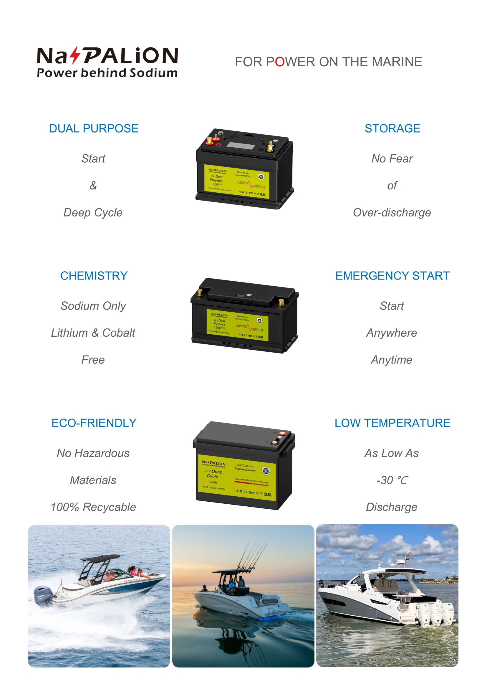 Lead acid battery has been dominated the marine battery market for more than one century. Lithium-ion battery is not good at cold-starting the engine and therefore cannot meet the requirements of starting batteries. Sodium-ion battery has excellent low-temperature discharge performance and can still meet the 10C discharge requirements even at -28 degrees Celsius. In terms of CCA performance, sodium-ion battery is even more advantageous than lead acid battery.